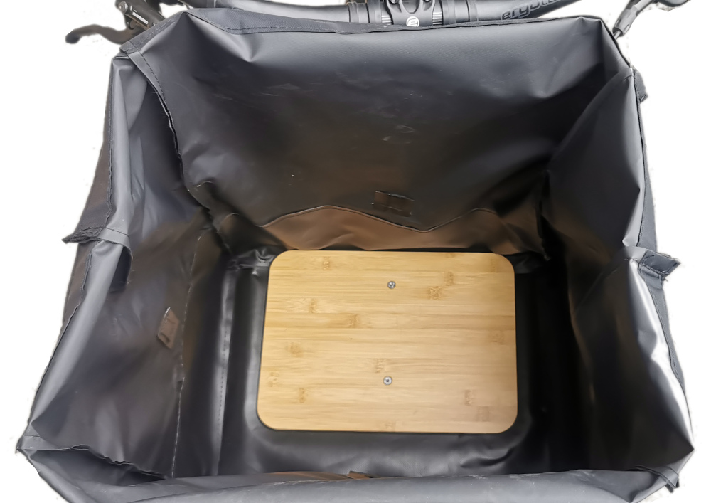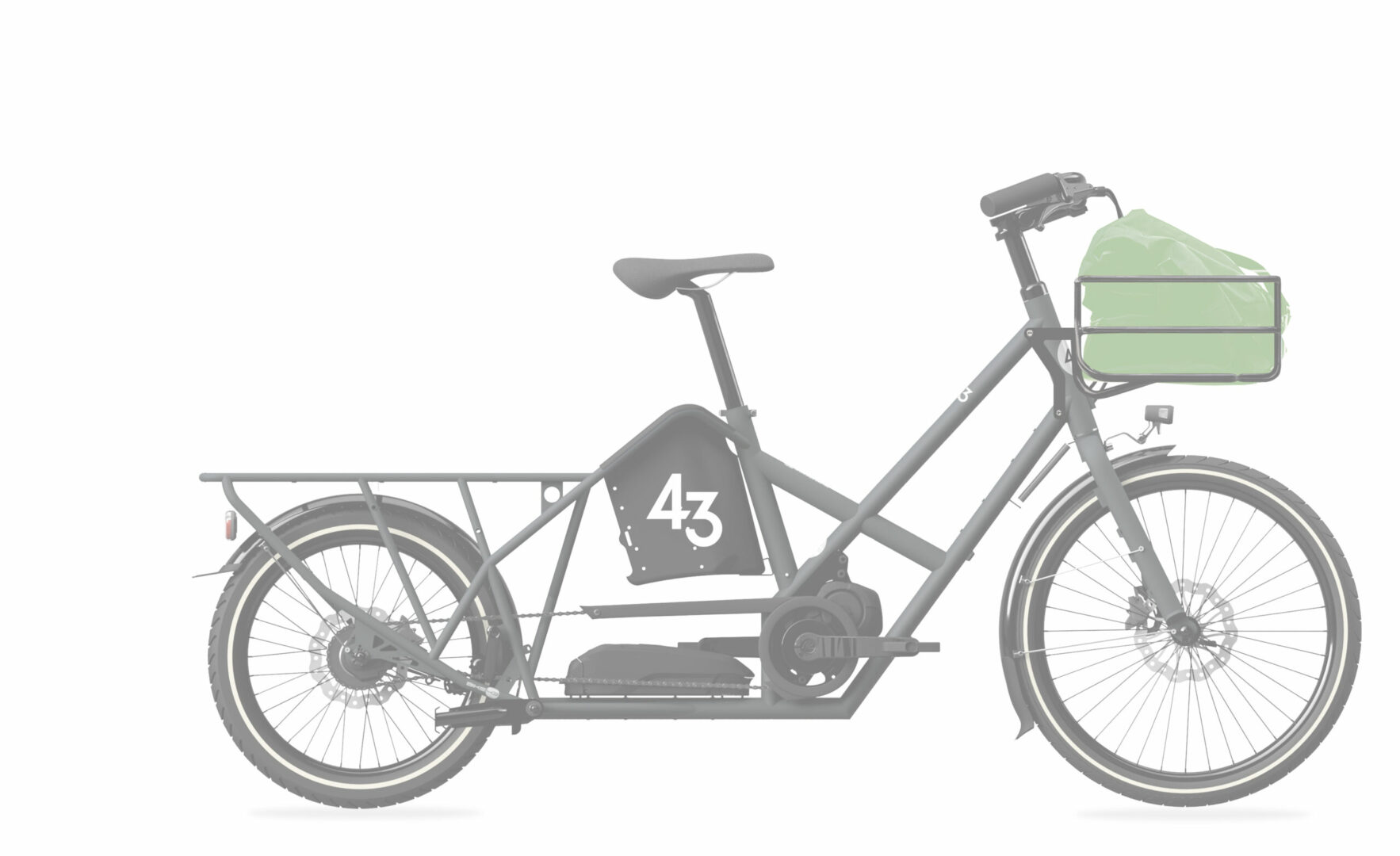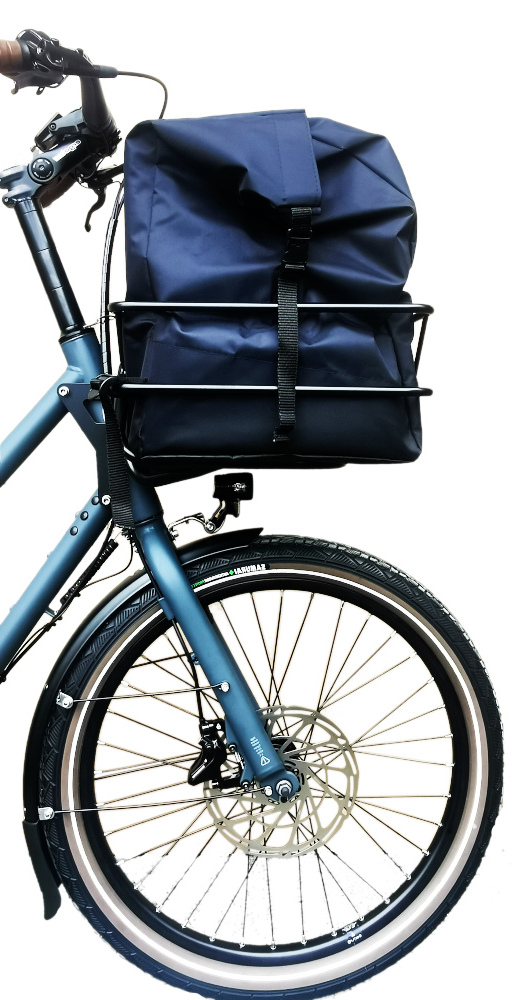 The Front Bag fits into the front basket, it has a volume of 35 liters. Leave the bag on the bike and use it as a container for stuff. It’s lighter than a basket and looks better too. The fabric is water repellent. There are straps on the side, and one on top to push down the content and avoid it going into the brake levers.